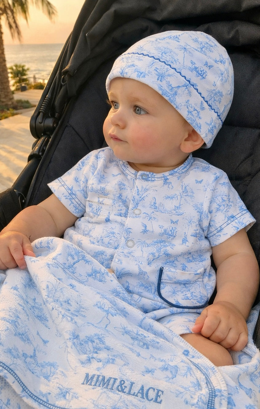 Ontdek het klassieke safari thema in zachte blauw en wittonen, ideaal voor je kleintje. Onze stijlvolle en tijdloze designs zijn perfect voor elke baby, met een comfortabele pasvorm en duurzame stoffen. Maak de outfit compleet met onze bijpassende accessoires voor een perfecte look. Alles wat je nodig hebt voor een schattige en stijlvolle baby!