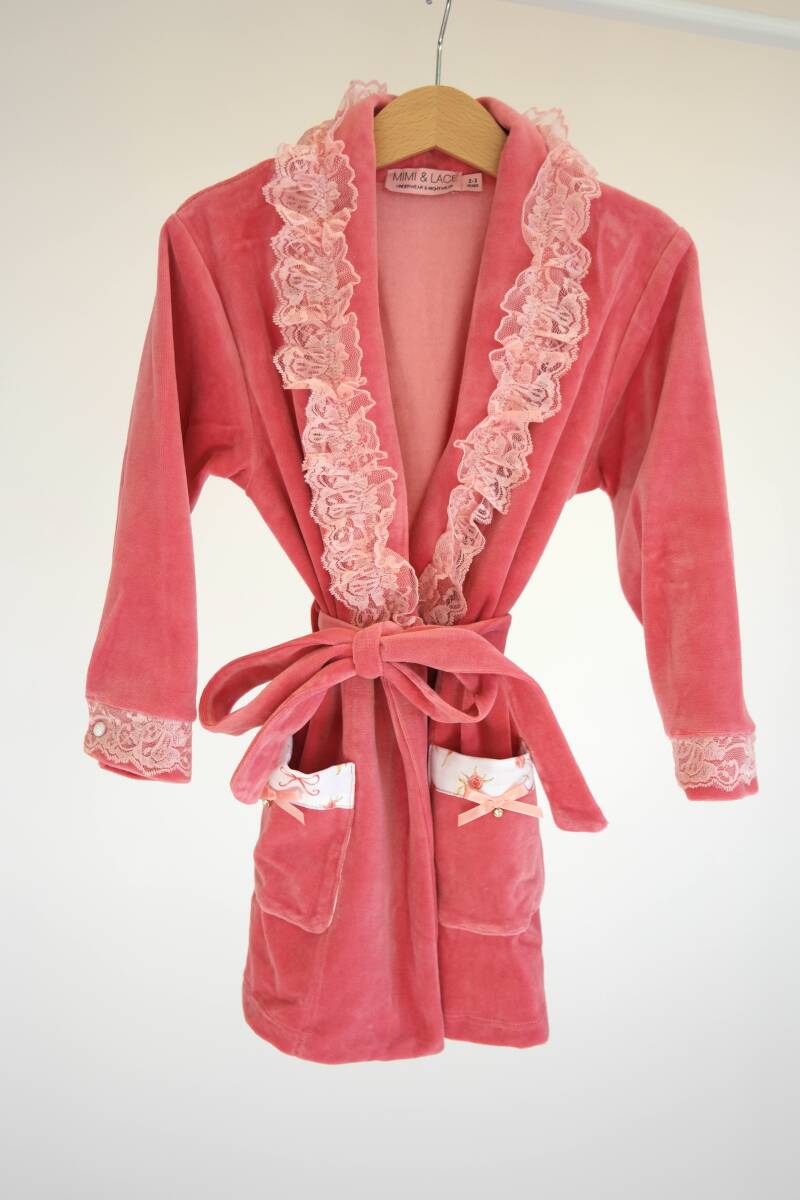 Deze luxueuze verlourse meisjes badjas is een echte droom voor je kleintje! Gemaakt van heerlijk zachte stof, biedt deze badjas ultiem comfort en warmte. De kanten details en elegante zijde strikjes met diamantjes voegen een verfijnde touch toe, terwijl de twee handige zakken perfect zijn voor kleine schatten. Het einde van de mouwen is afgewerkt met een delicate kanten strook en een parel knoop, wat zorgt voor een extra vleugje glamour. Ideaal voor een stijlvolle en comfortabele look na het badderen of tijdens een ontspannen ochtend.