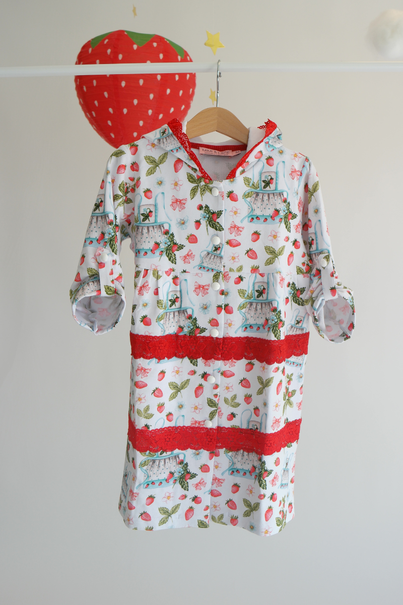 Deze luchtige, zomerse badjas past perfect bij de rest van de aardbeiencollectie. Afgewerkt met rode knoopjes en fijne kanten details voor een stijlvolle look. De mouwen zijn verstelbaar en kunnen zowel kort als lang gedragen worden dankzij een extra knoopje handig én schattig!
