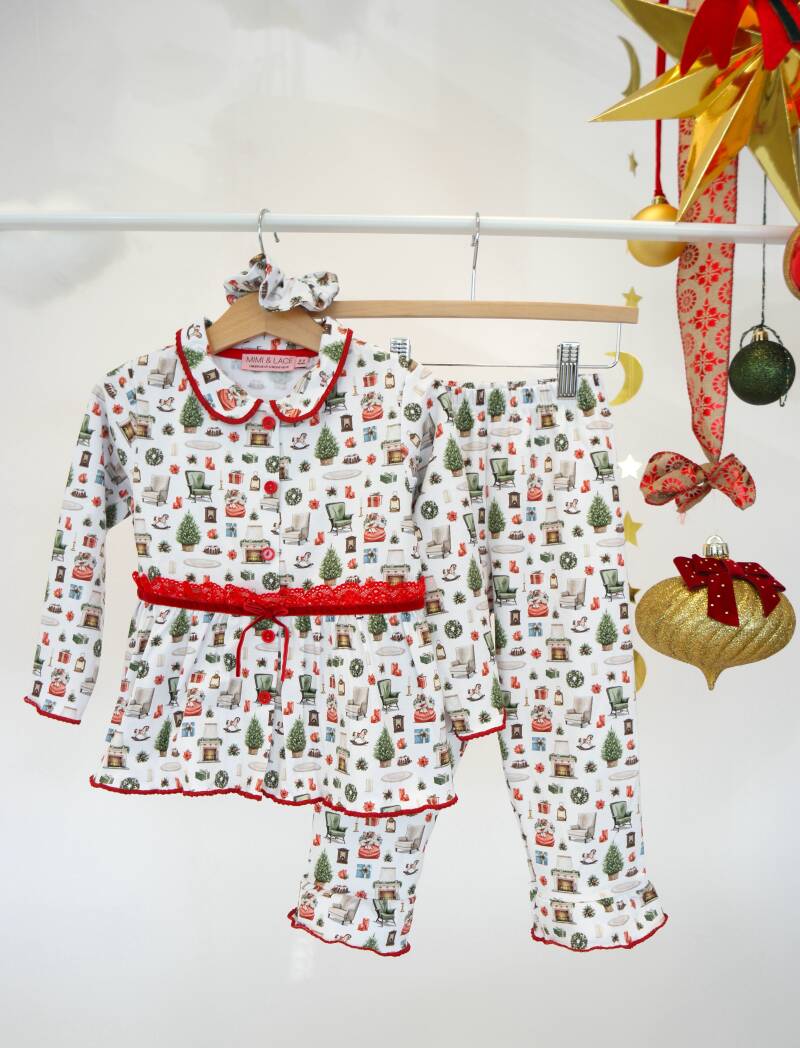 Dit klassieke model heeft schattige knoopjes, een stijlvol kraagje, en een feestelijke, rode kanten bies die het geheel afmaakt. Het klein suède strikje voegt een extra charmant detail toe. De pyjama is bedrukt met vrolijke kerstafbeeldingen van een kerstboompje, cadeaus en een hobbelpaard, wat een warme en gezellige sfeer uitstraalt.