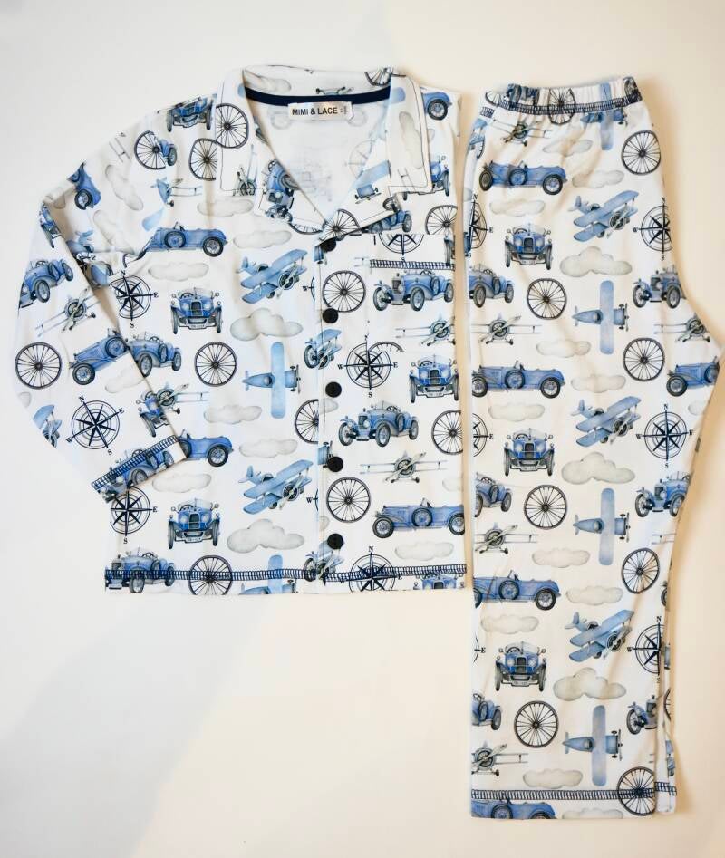 Dit leuke klassieke model pyjama bestaat uit een broek en blouse met knoopjes.